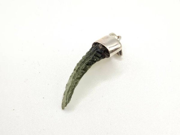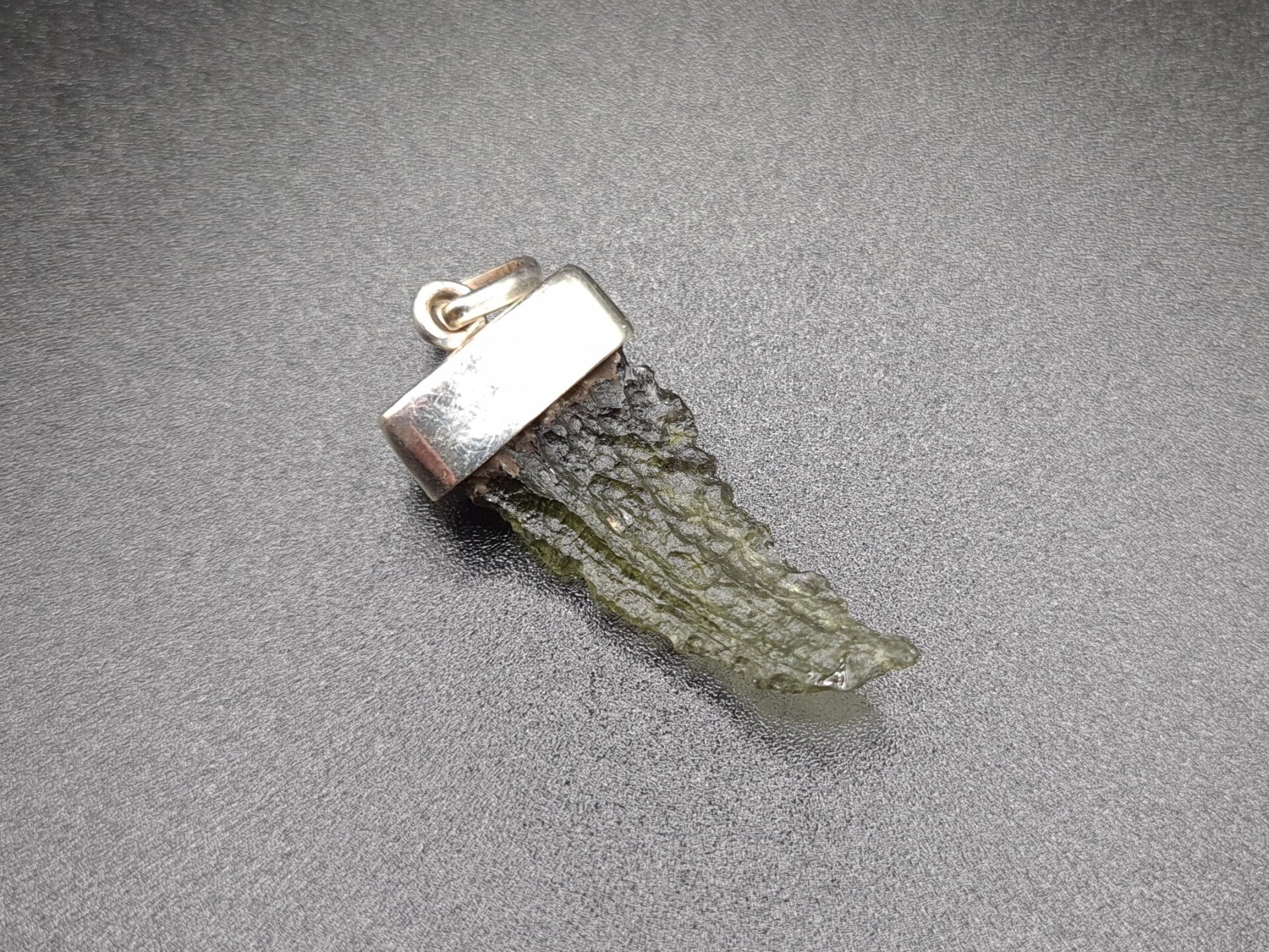 Dieser schöne grün leuchtende transparente Edelstein ist schon über 15 Millionen Jahre alt, denn er entstand beim Ries Ereignis, einem großen Asteroideneinschlag auf die Erde. Als dieser im heutigen Bayern (Deutschland) einschlug, bildete sich durch die enorme Hitze der Moldavit und wurde durch die riesige Kraft bis zu 400km weit ins heutige Tschechien geschleudert. Die Fassung mit Öse aus 925er Silber umfasst den breiten Teil des Moldavits.