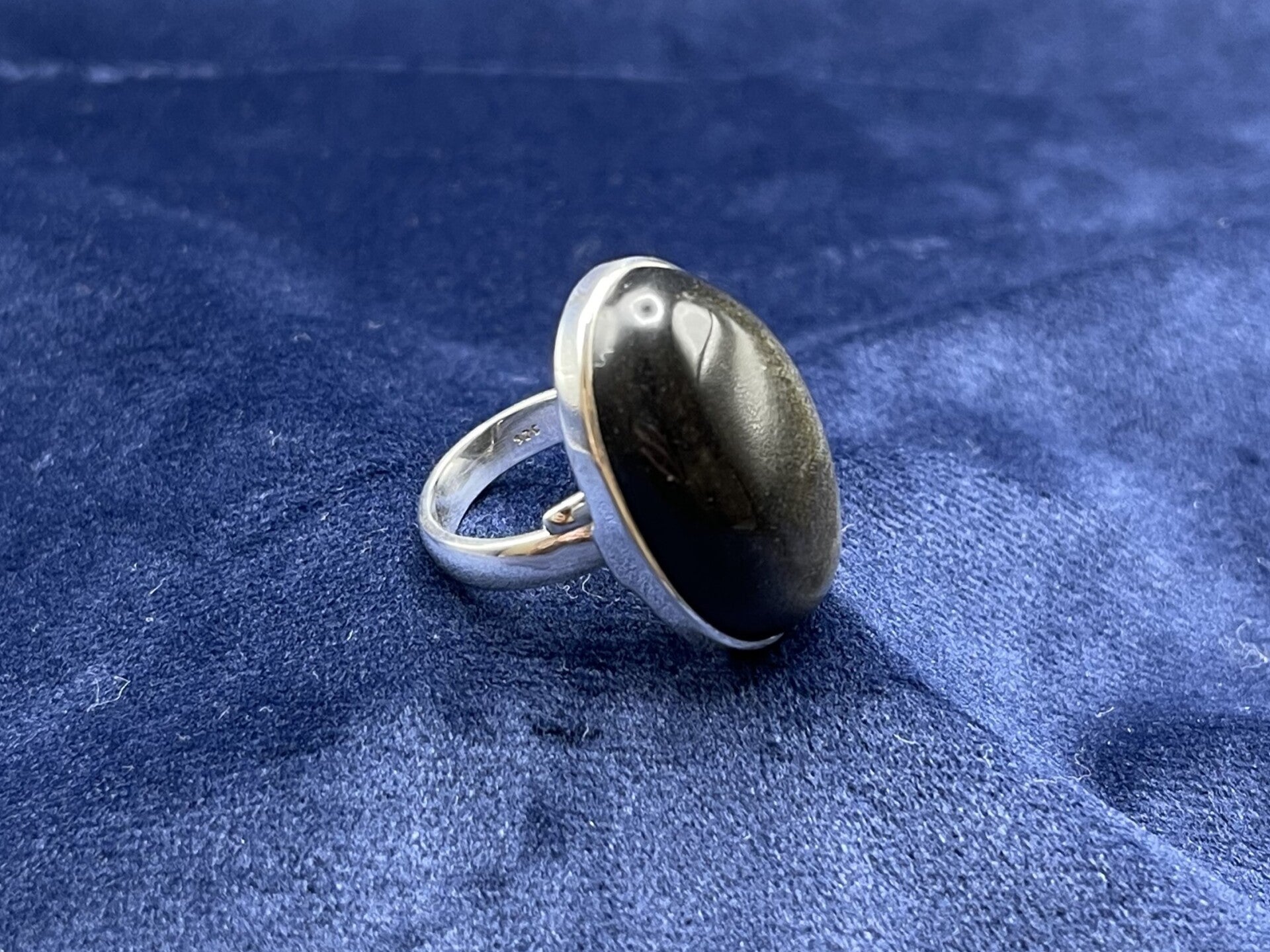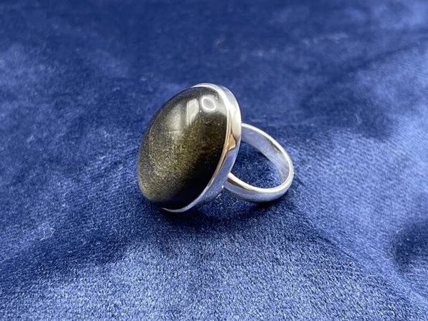 Der Ring besteht aus meisterhaft gearbeitetem 925er massiven Silber. Der ovale, glänzend polierte Goldobsidian zeichnet sich besonders durch seine goldschimmernde Oberfläche aus, welche auch bei diesem Exemplar unverkennbar ist und dem Ring in Verbindung mit der ovalen Form des Edelsteins seinen eigenen Charme verleiht.