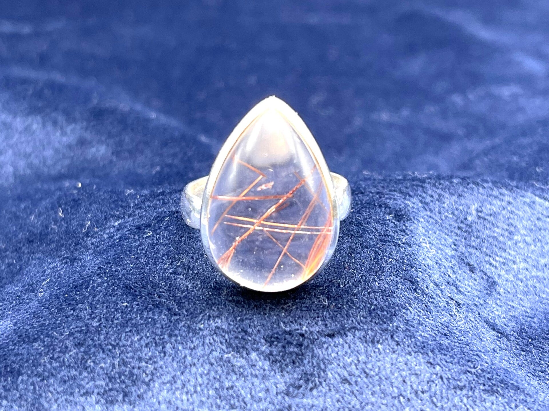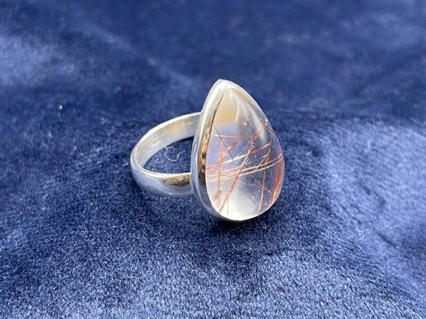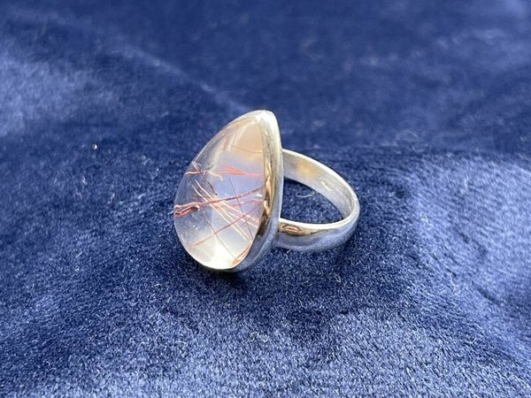 Der Ring besteht aus meisterhaft gearbeitetem 925er massiven Silber. Die tropfenförmige Fassung des Rutilquarzes setzt den klaren Juwel gekonnt in Szene. Die nadelförmigen Rutileinschlüsse im Bergkristall geben dem Edelstein eine zarte rosa Färbung, wodurch dem Ring sein eigener Charme verliehen wird.