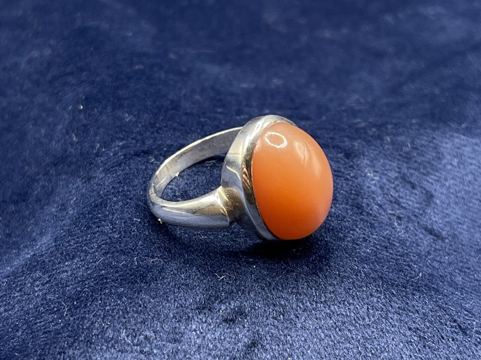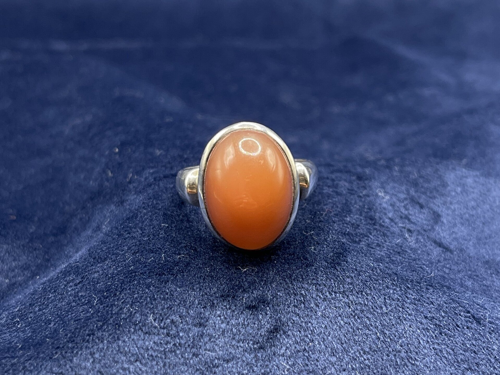 Der Ring besteht aus meisterhaft gearbeitetem 925er massiven Silber. Die schlichte Fassung des Mondsteins setzt den oval, runden Edelstein gekonnt in Szene. Besonders verzaubert bei diesem Exempar, neben der satten orangenen Farbe, das typische Schimmern des Mondsteins, wodurch dieser Ring trotz seiner Schlichtheit zu einem Hingucker wird.