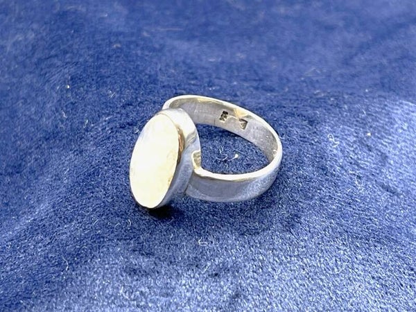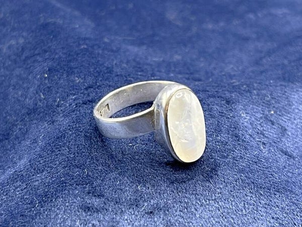 Der Ring besteht aus meisterhaft gearbeitetem 925er massiven Silber. Der weißlich wirkende Labradorit schimmert in den verschiedenste blau, grün und rosa Tönen, wodurch der Ring seinen bezaubernden Charme erhält. Hinzu kommt das schlichte, jedoch Eindruck schindende Detail des versetzen Ringes, was dieses Exemplar zu einem kleinen Highlight macht.