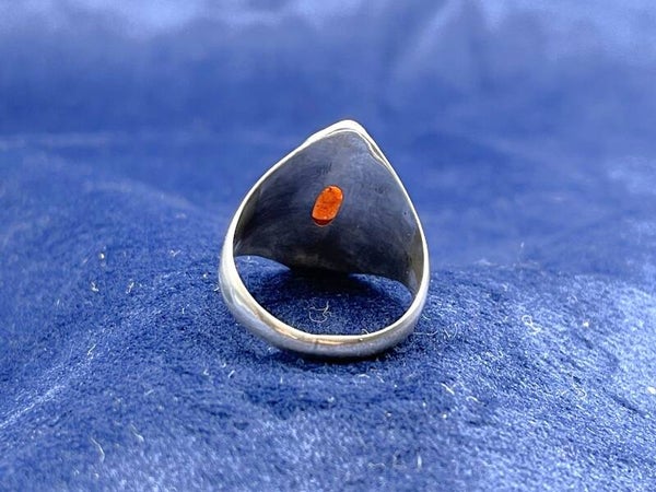 Der Ring besteht aus meisterhaft gearbeitetem 925er massiven Silber, welcher nach vorne breit in ein Trapez auseinander läuft. Zudem befinden sich auf der Fassung kunstvolle Details, welche den rötlich schimmernden Stein umso mehr betonen.