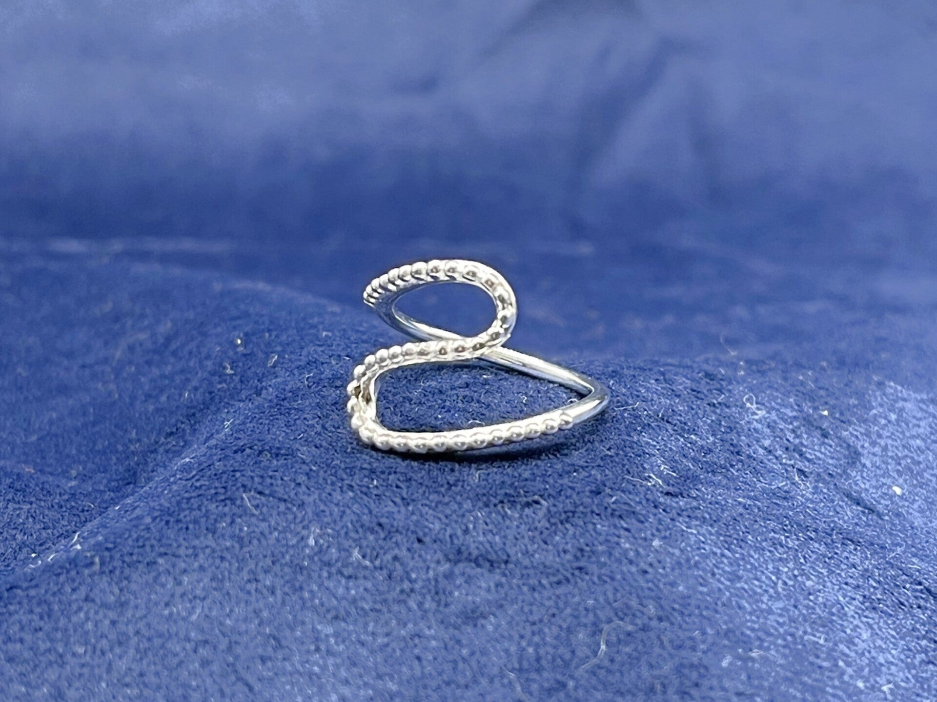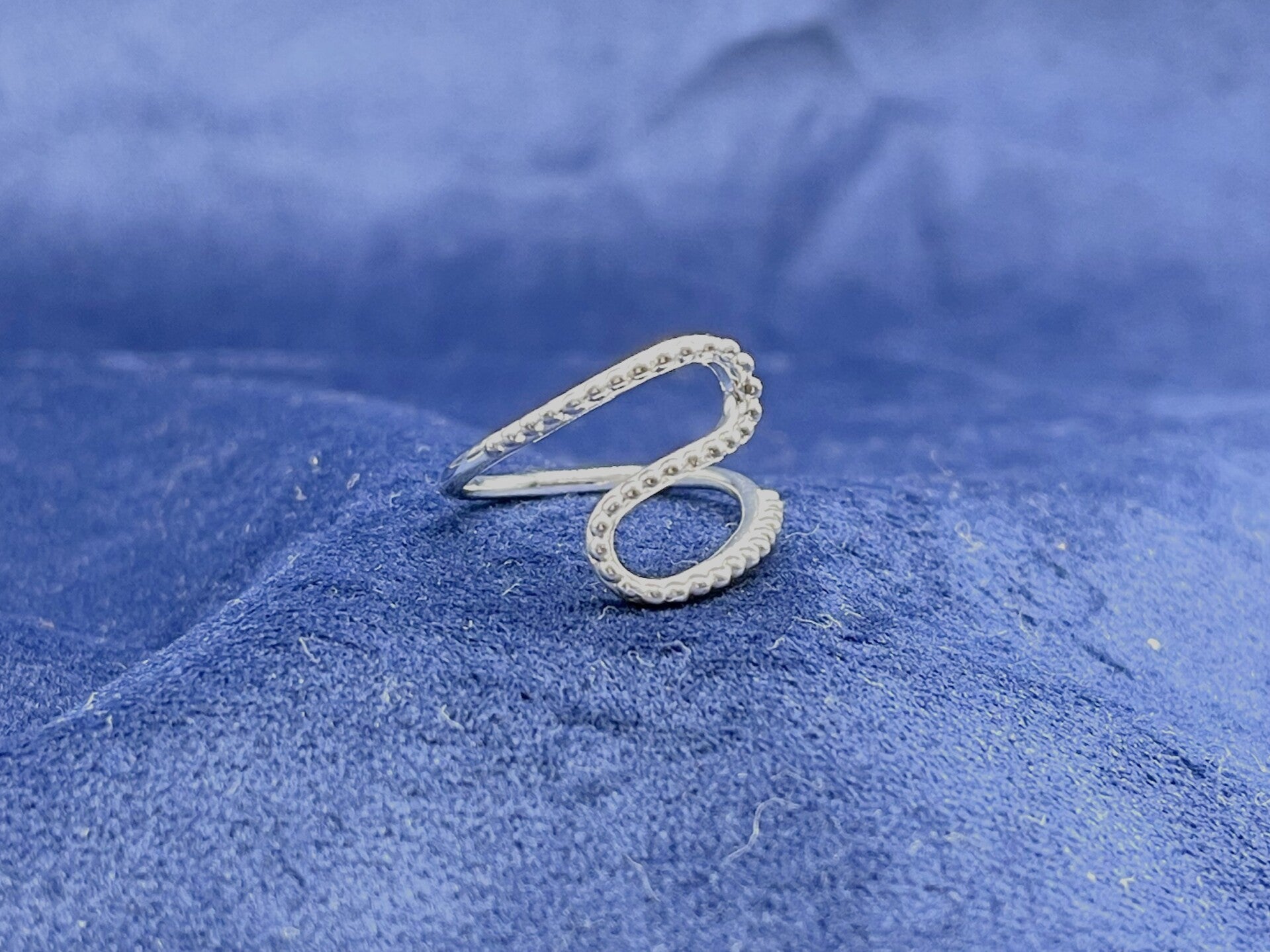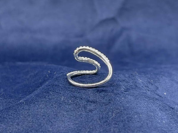 Der Ring besteht aus meisterhaft gearbeitetem 925er massiven Silber. Der wellen- oder schlangenartig gewundener Ring ist vorne mit kleinen Silberkügelchen besetzt und trägt zu seinem schlichten, jedoch schicken Charme bei.