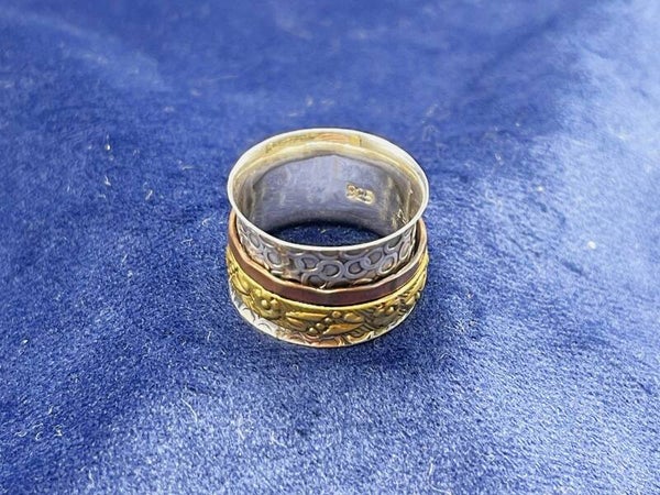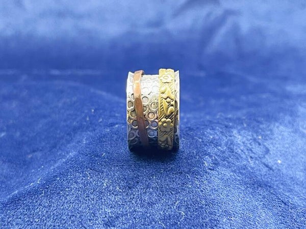 Der Ring besteht aus meisterhaft gearbeitetem 925er massiven Silber. Auf dem breiteren unteren Ring befinden sich zwei dünnere, ebenso kunstvoll gearbeitete, frei bewegliche Ringe bestehend aus detailreichen Messing und Kupfer, was diesem Exemplar seinen besonderen Charme verleiht. Während der untere Ring ein schmuckvolles Punktmuster aufweist, handelt es sich bei dem Messing Ring um stilvolle Blumen, wodurch ein herrliches Zusammenspiel entsteht. Durch den beweglichen Part des Ringes ist dieser nicht bloß besonders modern, sondern gilt auch als "Anxiety Ring" und kann beruhigend wirken oder Meditationen unterstützen.