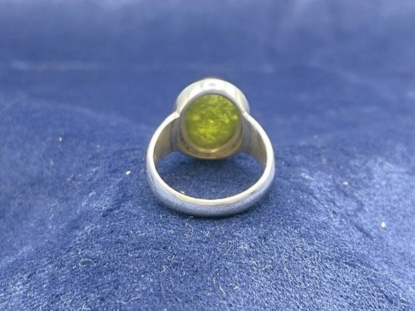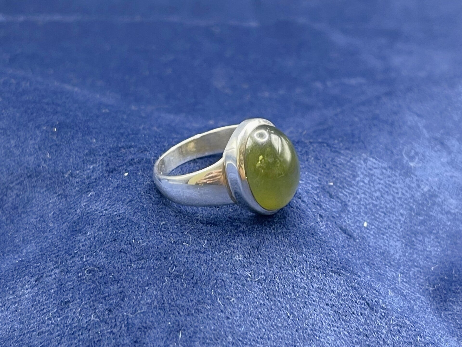 Der Ring besteht aus meisterhaft gearbeitetem 925er massiven Silber. Der klare, dunkelgrüne Juwel ragt über seine schlichte Fassung heraus. Fällt etwas Licht direkt in den Edelstein hinen, so strahlt er in einem hellen grün. Durch seinen runden Schliff glänzt prächtig und verleiht diesem Ring trotz seiner Schlichtheit einen bezaubernden Charme.