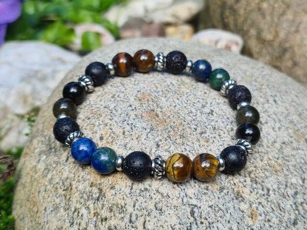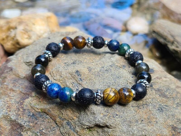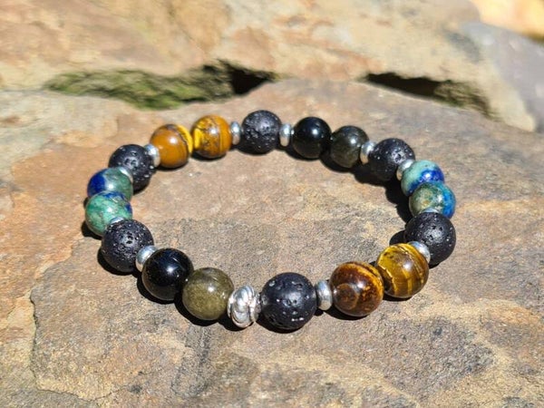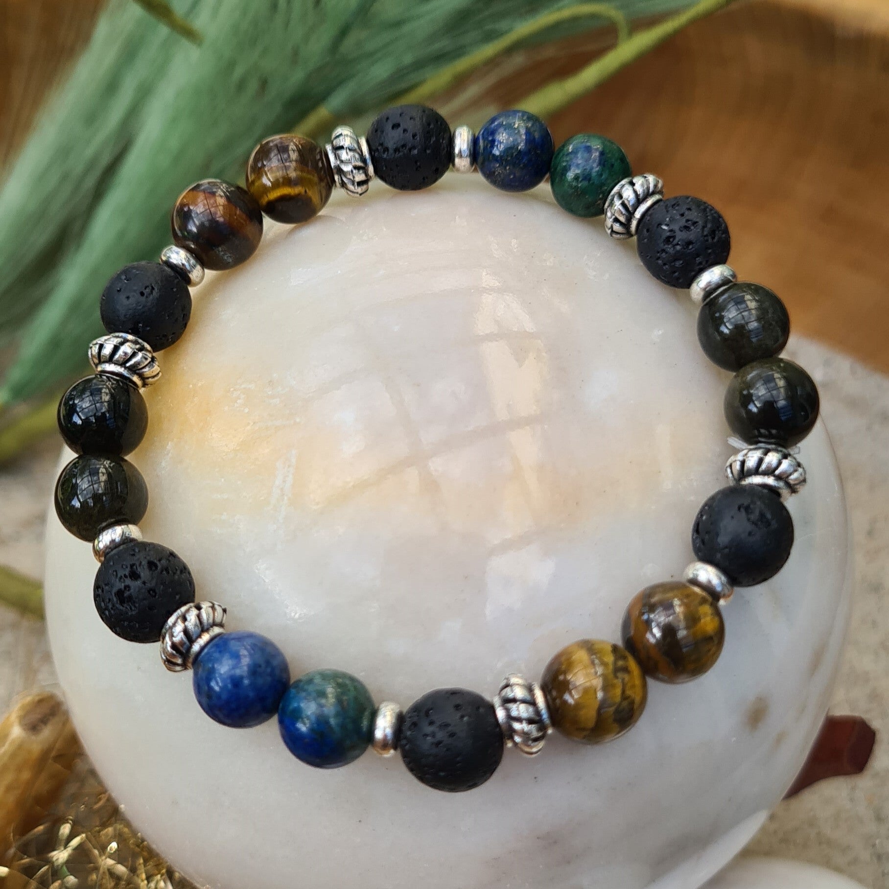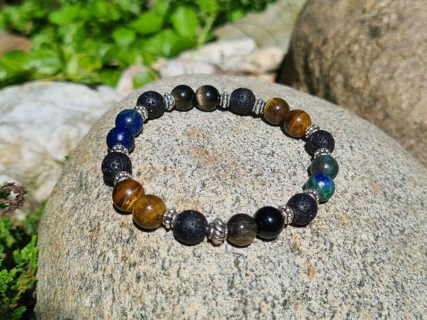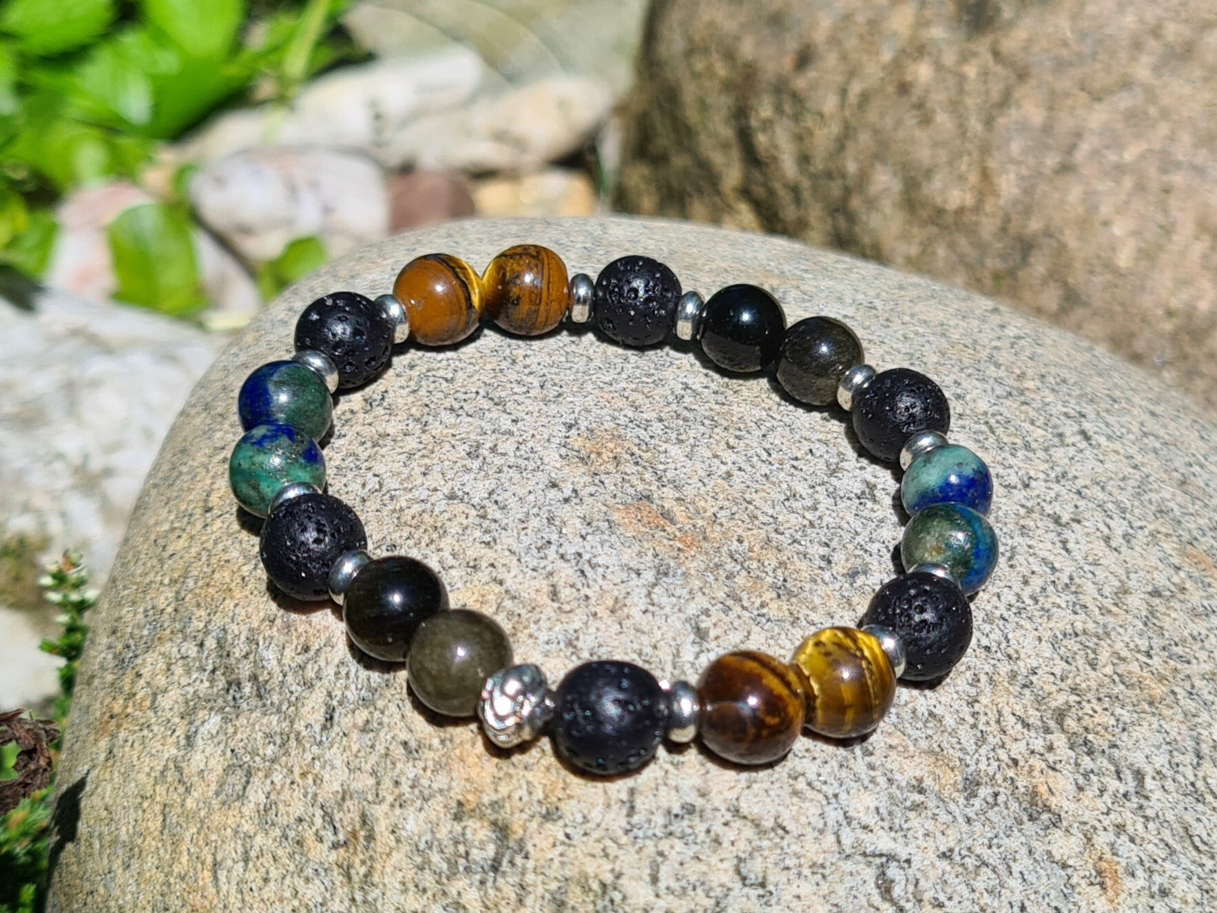 Armband "Release Yourself" mit Goldobsidian, Azurit-Malachit, Tigerauge und Lavaperlen