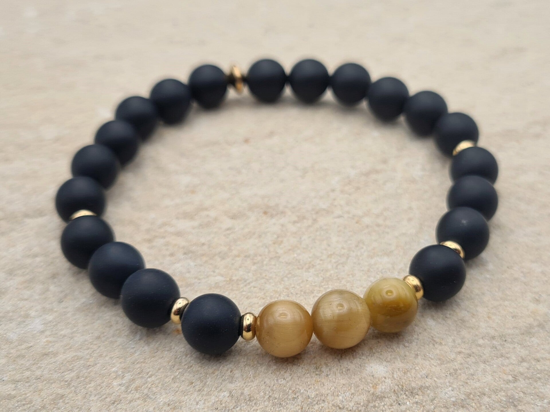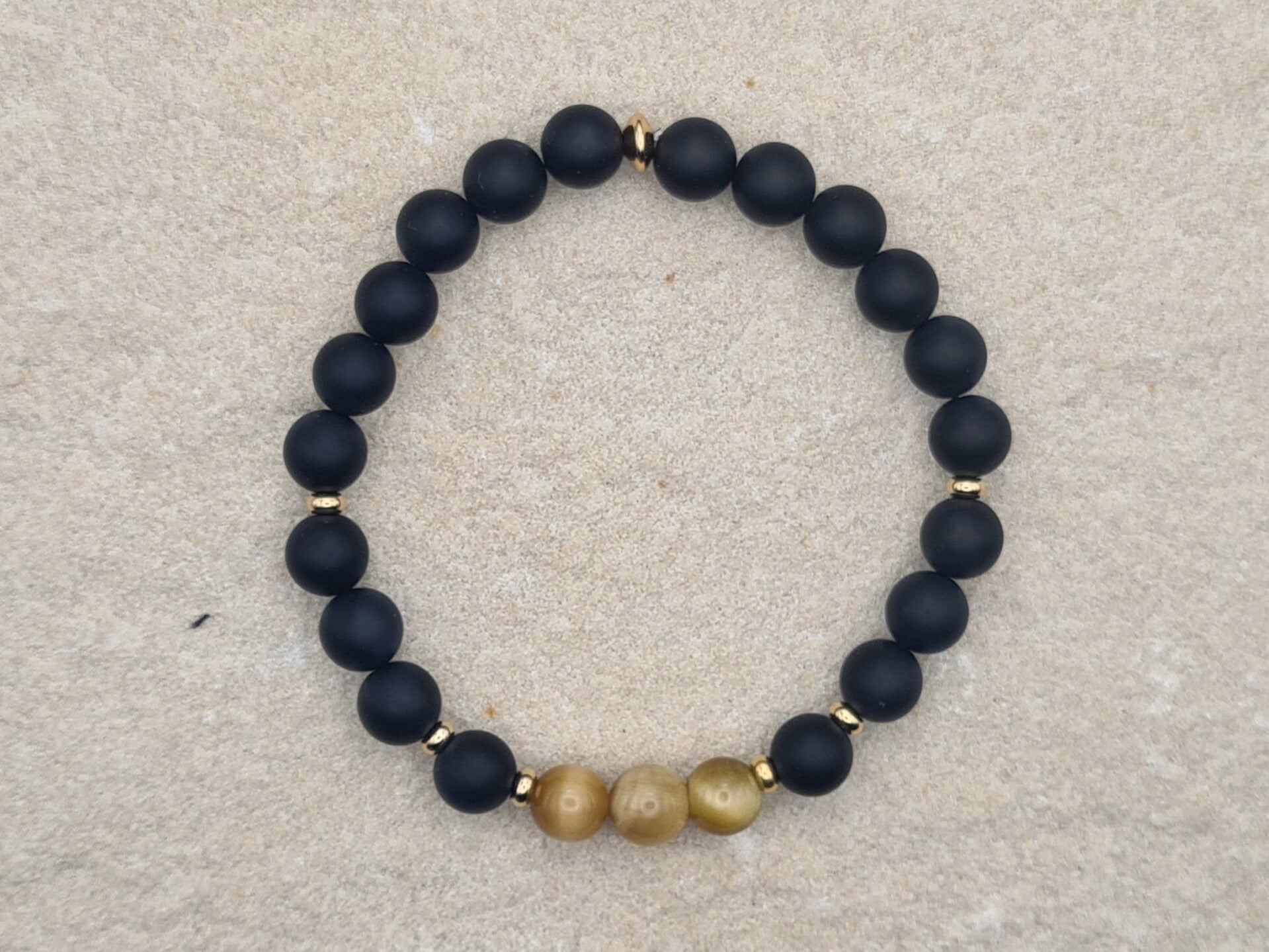 Ein exklusives Armband mit matten Edelsteinperlen aus Onyx und drei hellen Tigeraugen, sowie Zwischenperlen aus vergoldetem Edelstahl. "Made with Love" in unserer Werkstatt in Dortmund.