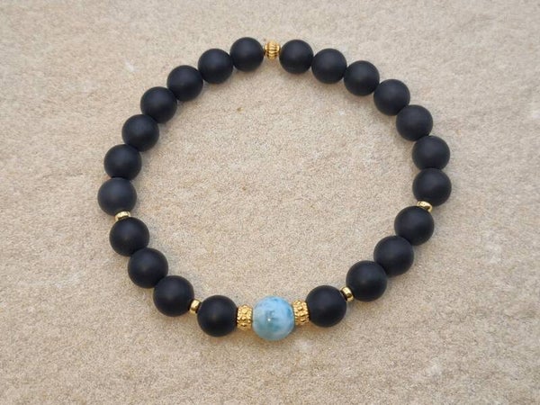 Ein exklusives Armband mit matten Edelsteinperlen aus Onyx und Larimar, sowie Zwischenperlen aus vergoldetem 925er Silber und kleinen vergoldeten Edelstahlringen. "Made with Love" in unserer Werkstatt in Dortmund.