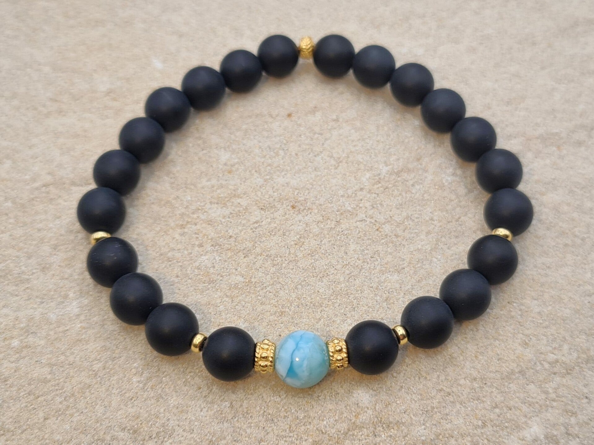 Ein exklusives Armband mit matten Edelsteinperlen aus Onyx und Larimar, sowie Zwischenperlen aus vergoldetem 925er Silber und kleinen vergoldeten Edelstahlringen. "Made with Love" in unserer Werkstatt in Dortmund.
