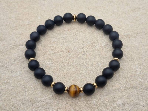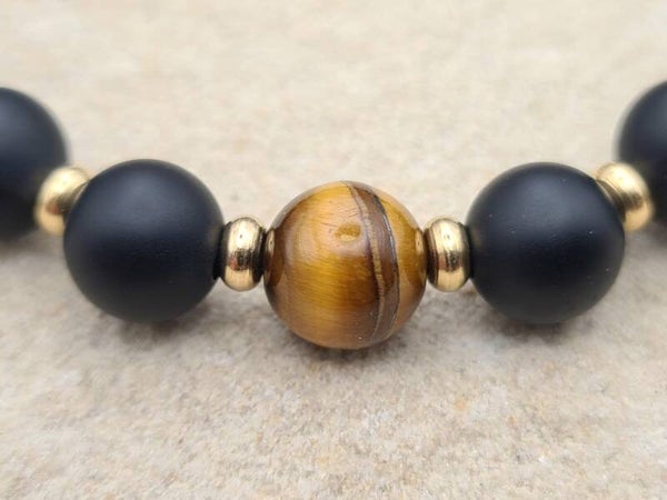 Ein exklusives Armband mit matten Edelsteinperlen aus schwarzem Onyx und goldgelbem Tigerauge, sowie Zwischenperlen aus 24-Karat vergoldeten Edelstahlringen. "Made with Love" in unserer Werkstatt in Dortmund.