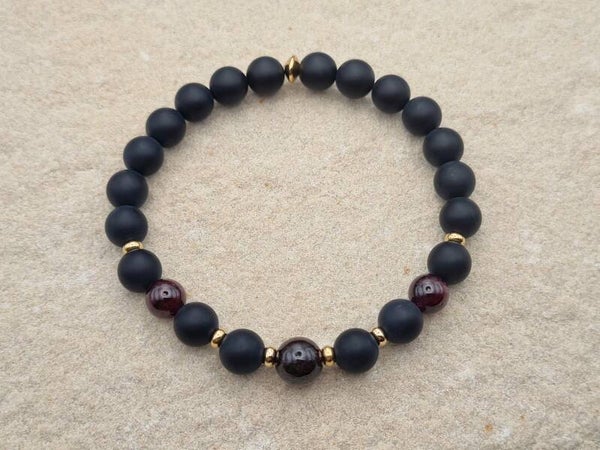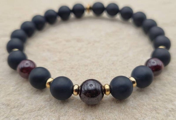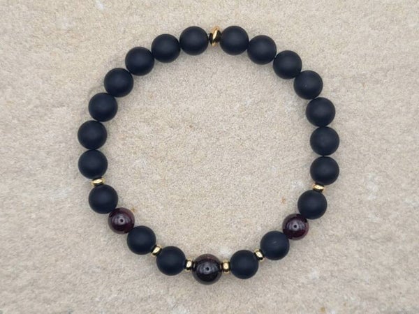 Ein exklusives Armband mit matten Edelsteinperlen aus schwarzem Onyx und drei dunkelroten Granate, sowie Zwischenperlen aus 24-Karat vergoldeten Edelstahlringen. "Made with Love" in unserer Werkstatt in Dortmund.
