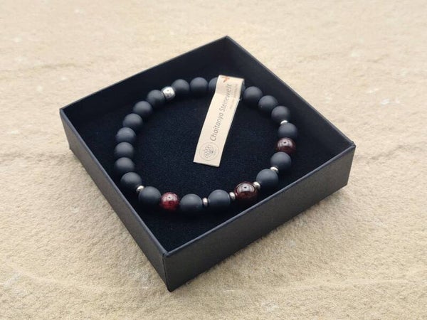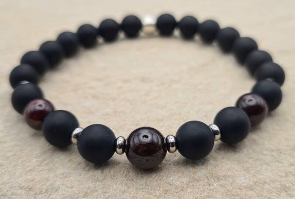 Ein exklusives Armband mit matten Edelsteinperlen aus schwarzem Onyx und drei dunkelroten Granate, sowie Zwischenperlen aus Edelstahl. "Made with Love" in unserer Werkstatt in Dortmund.