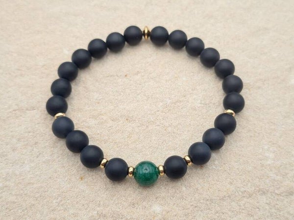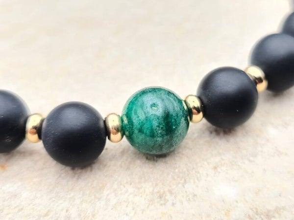Ein exklusives Armband mit matten Edelsteinperlen aus schwarzem Onyx und smaragdfarbenen Budstone, sowie Zwischenperlen aus 24-Karat vergoldetem Edelstahl. "Made with Love" in unserer Werkstatt in Dortmund.