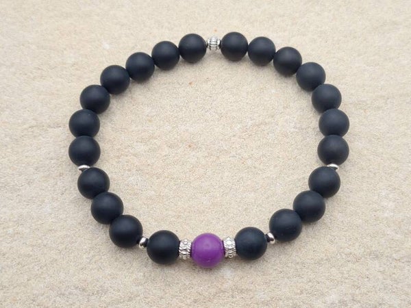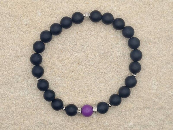 Ein exklusives Armband mit matten Edelsteinperlen aus Onyx und violettem Phosphorsiderit, sowie Zwischenperlen aus rhodiniertem 925er Silber.