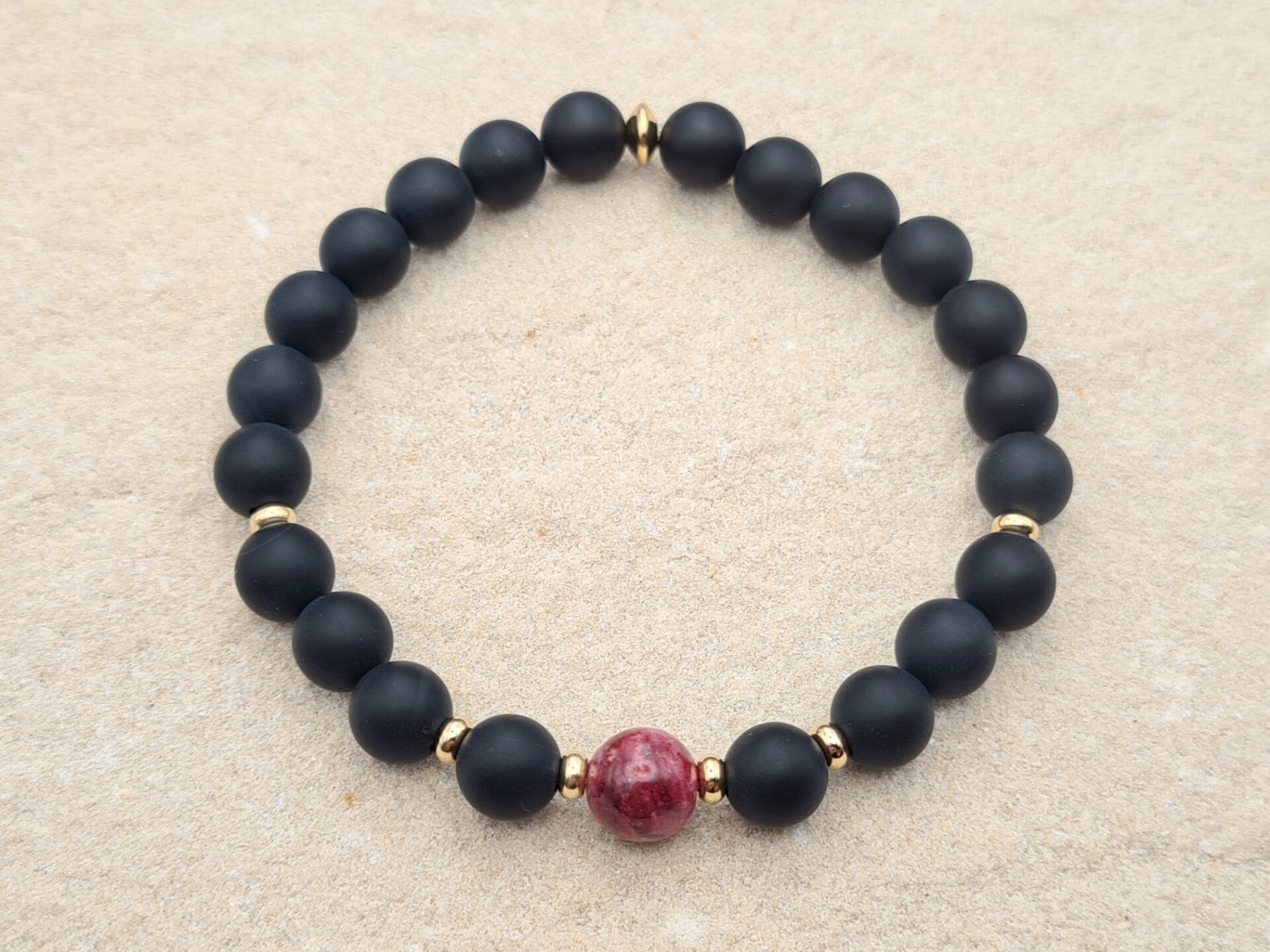 Ein exklusives Armband mit matten Edelsteinperlen aus schwarzem Onyx und norwegischem Thulit, sowie Zwischenperlen aus 24-Karat vergoldetem Edelstahl. "Made with Love" in unserer Werkstatt in Dortmund.