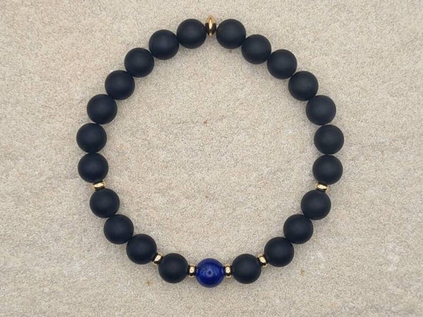 Ein exklusives Armband mit matten Edelsteinperlen aus schwarzem Onyx und tiefblauem Lapislazuli, sowie Zwischenperlen aus 24-Karat vergoldetem Edelstahl. "Made with Love" in unserer Werkstatt in Dortmund.