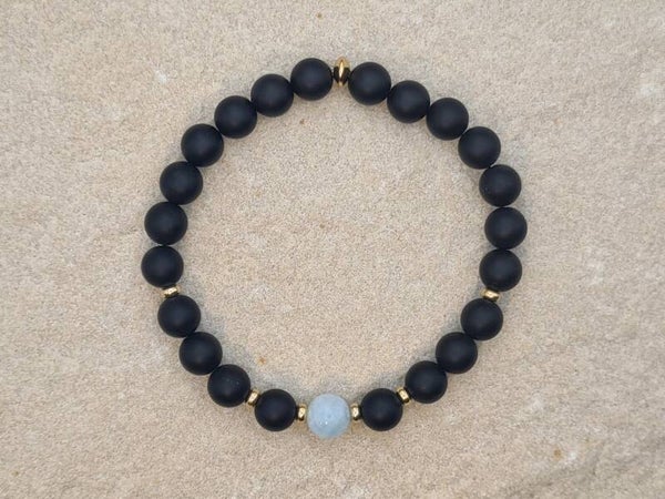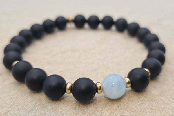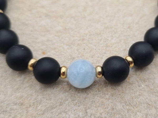 Ein exklusives Armband mit 8mm-Edelsteinperlen aus schwarzem matten Onyx und erfrischendem Aquamarin, sowie Zwischenperlen aus 24-Karat vergoldetem Edelstahl.