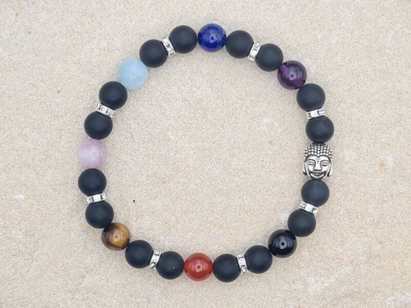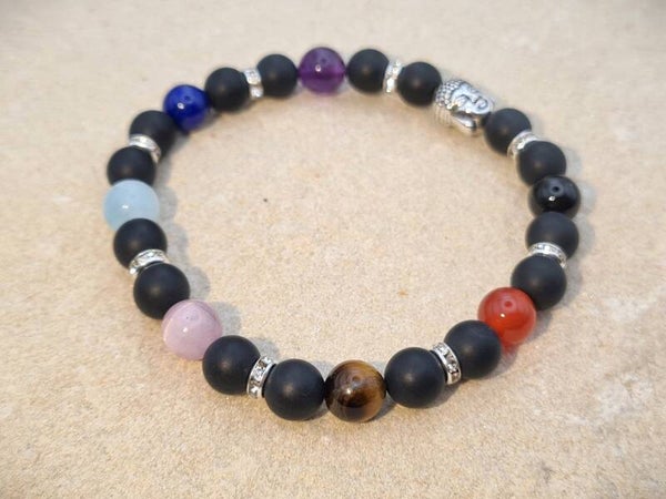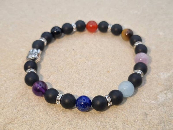 Dieses kraftvolle Schmuckstück ist nicht nur wegen seines Aussehens, sondern auch wegen seiner Wirkung einzigartig. Die Schwingungen der Farben und der inneren Strukturen der verwendeten natürlichen Edelsteine entsprechen direkt den Schwingungen der Chakren. Dadurch lädt das Armband die Energie von Körper, Geist und Seele auf. Die Kombination aus sieben Edelsteinen, zusammen mit dem schwarzen Turmalin Schörl, der für eine kraftvolle Erdung, Neutralität und Schutz vor fremden Energien sorgt, erzeugt das Armband einen perfekt ausbalancierten Energiefluss auf körperlicher und emotionaler Ebene.