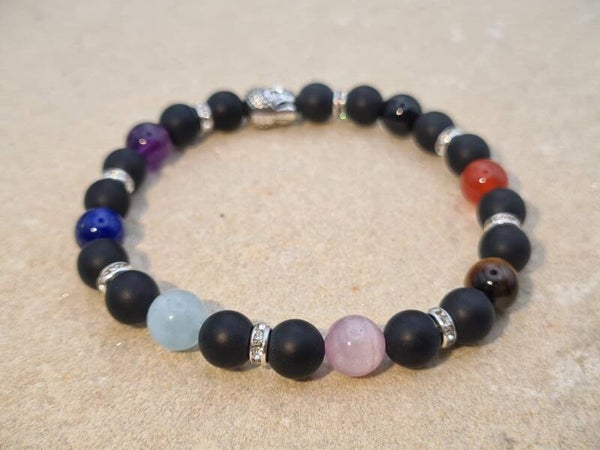 Ein exklusives Armband mit 8mm-Edelsteinperlen aus schwarzem matten Turmalin Schörl und sieben hochwertigen Edelstein-Chakra-Perlen, sowie glitzernden Zwischenperlen.