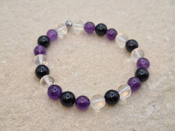 Ein exklusives Armband mit 8mm-Edelsteinperlen aus Turmalin Schörl, Amethyst und Bergkristall, sowie einer silberfarbenen Verschlussperle.