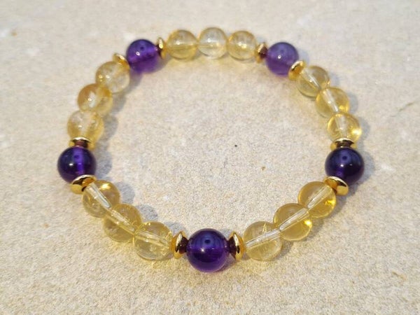 Ein echtes Unikat mit 8mm-Edelsteinperlen aus Amethyst und Citrin sowie Zwischenperlen aus 24 Karat vergoldetem Edelstahl.