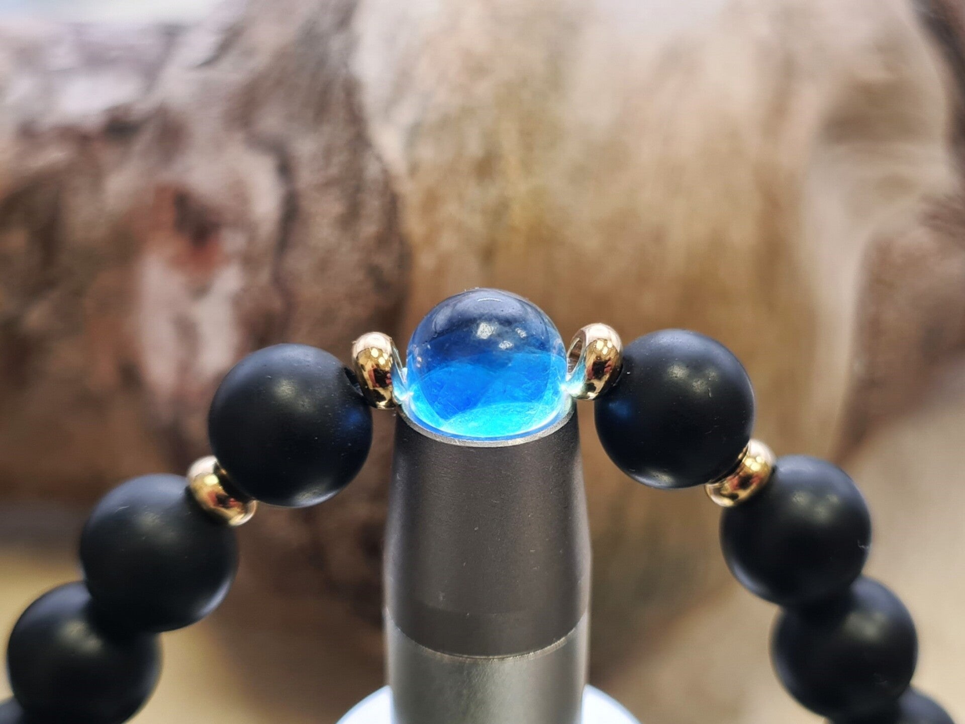 Ein exklusives Armband mit matten Edelsteinperlen aus schwarzem Onyx und einem blauen Saphir, sowie Zwischenperlen aus 24K-vergoldetem Edelstahl.