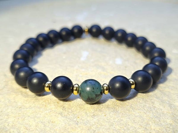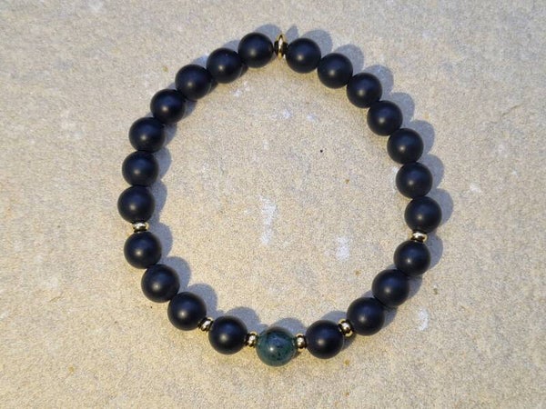 Ein exklusives Armband mit matten Edelsteinperlen aus schwarzem Onyx und einem grünen Smaragd, sowie Zwischenperlen aus 24K-vergoldetem Edelstahl.