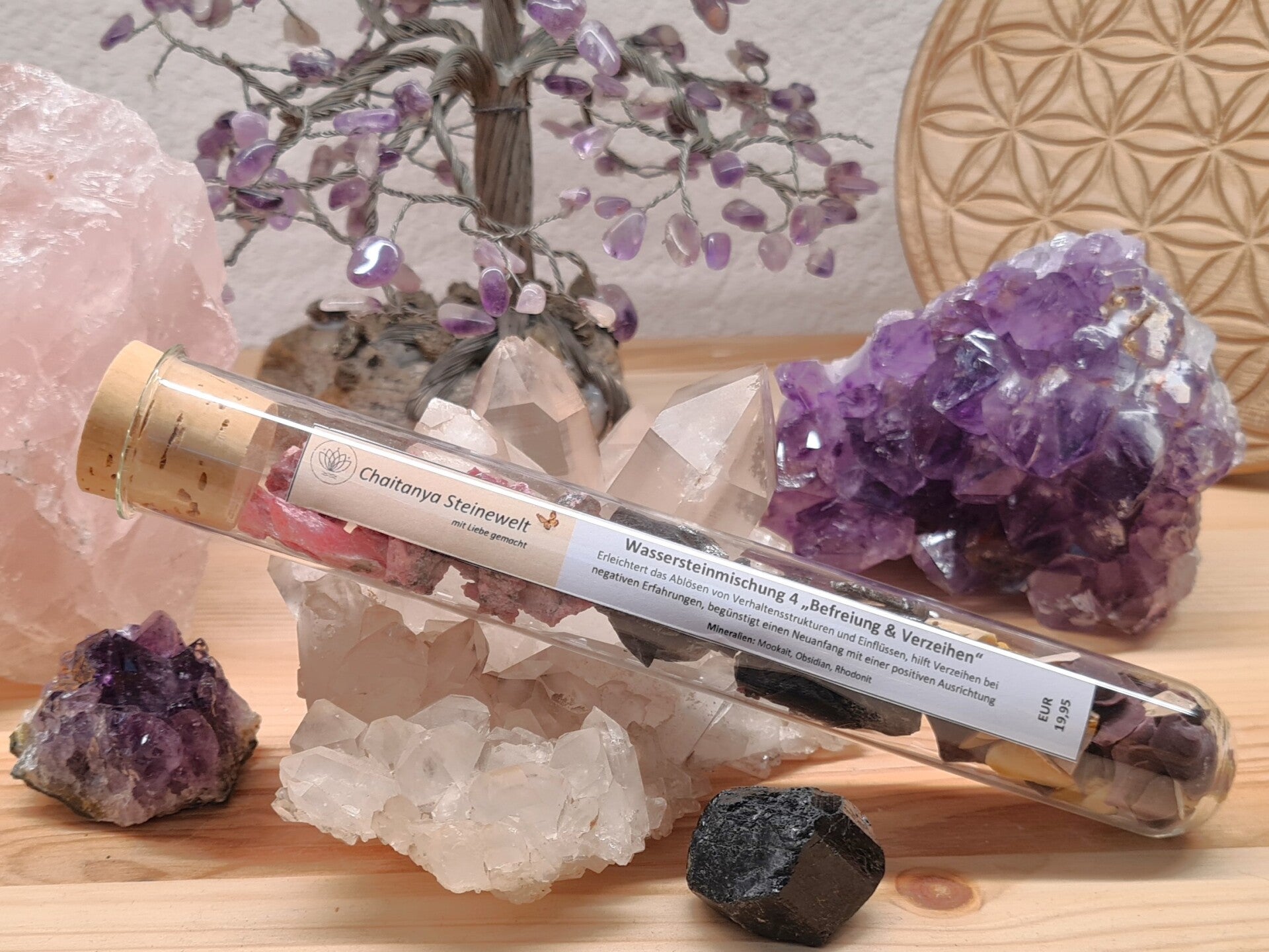 Wassersteinmischung 4 "Befreiung & Verzeihen“, Mookait, Obsidian, Rhodonit, Reagenzglasmethode