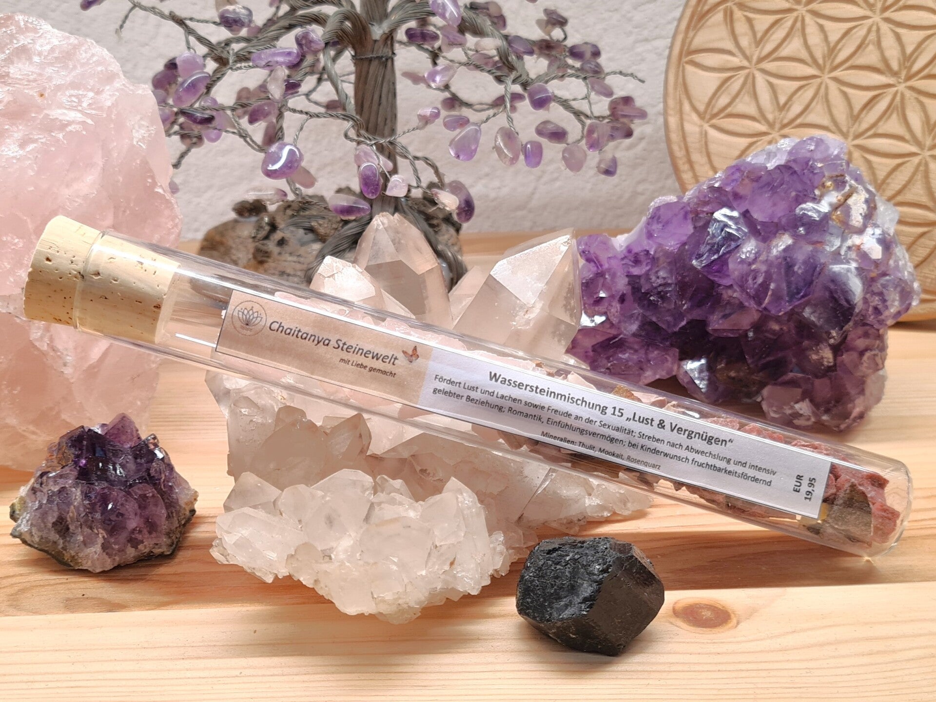 Wassersteinmischung 15 "Lust und Vergnügen“, Thulit, Mookait, Rosenquarz, Reagenzglasmethode