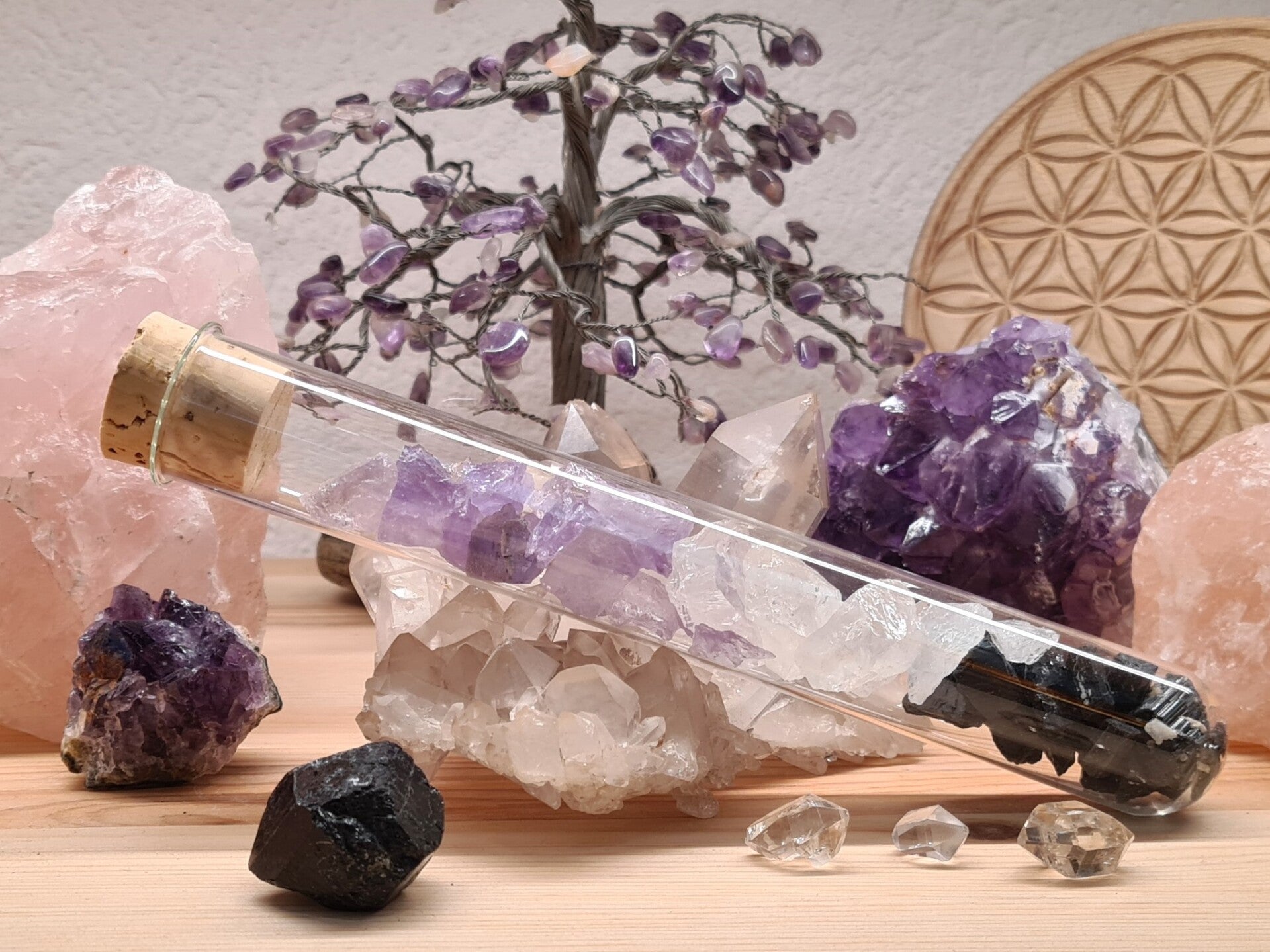 Wassersteinmischung 19 "Schutz und Befreiung“, Amethyst, Bergkristall, Turmalin Schörl, Reagenzglasmethode