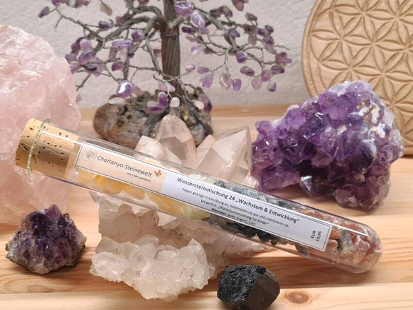 Du erhälst das abgebildete Reagenzglas mit der Wassersteinmischung. Die Deko ist im Kauf nicht enthalten, ist aber verkäuflich: