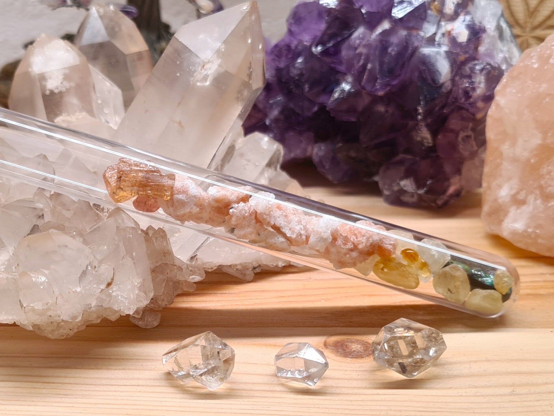 Wassersteinmischung 13 "Glück und Lebensfreude“, Edelopal, Sonnenstein, Topas gelb, Goldtopas, Reagenzglasmethode