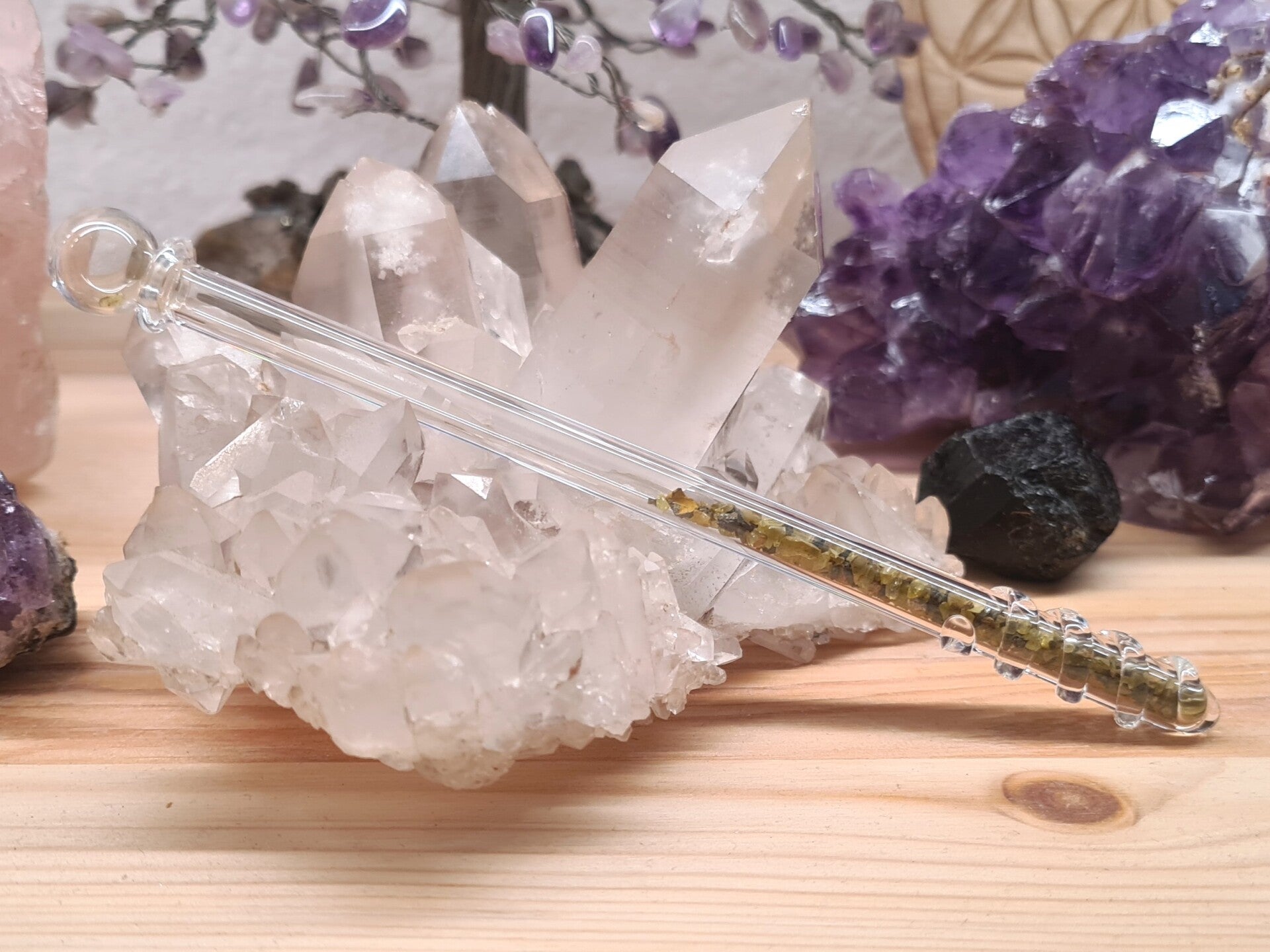 Pallasit schenkt Motivation und stärkt das Bewusstsein. Er verleiht die Fähigkeit, die Ursache und den Sinn eigener Ansichten oder Ziele zu erforschen und zu beurteilen. Dadurch kann er sich auch von Abhängigkeit oder Unselbstständigkeit lösen lassen. Pallasit ist ein außerirdisches Mineral und hat demzufolge schon einiges vom Universum erfahren. Diese Informationen sind durch die Verwendung dieses Röhrchens zur Wasserenergetisierung zugänglich.