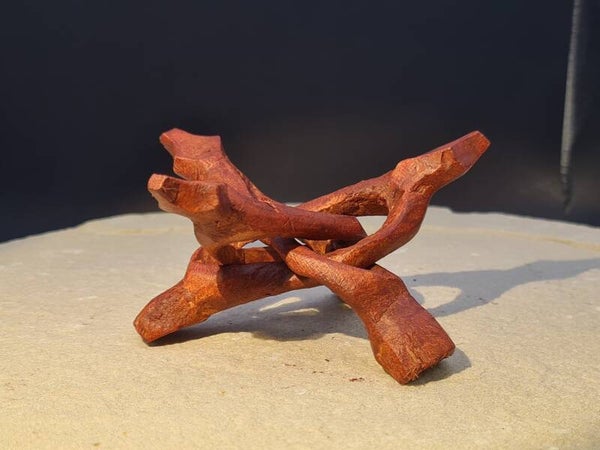 Der Kobra-Ständer bietet die perfekte Unterstützung für eine Abalone-Schale. Die Schale kann beim Smudgen von z.B. weißem Salbei oder Palo Santo heiß werden, und dann ist die Verwendung eines solchen Holzständers ideal, um zu verhindern, dass die Oberfläche ebenfalls heiß wird. Man kann den Ständer auch zum Stützen von z.B. Glaskugeln oder Klangschalen verwenden. Die ineinander verflochtenen Beine sind aus einem Stück Holz geschnitten und verleihen dem Stand eine geheimnisvolle Atmosphäre.