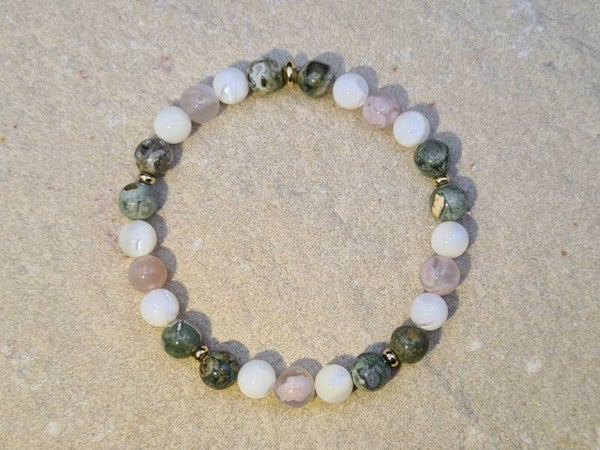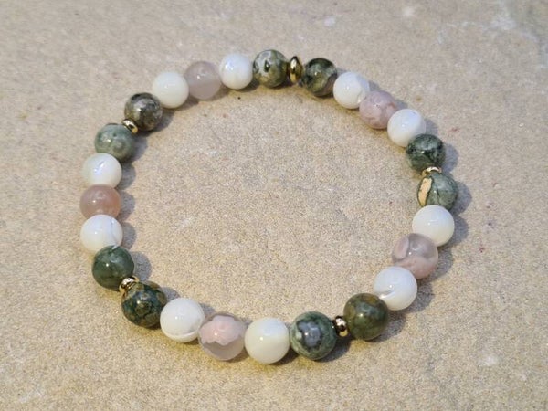 Ein hübsches, frisches Armband mit 8mm-Edelsteinperlen aus Perlmutt, Kirschblüten-Chalcedon und Regenwald-Rhyolith sowie Zwischenperlen aus 24K-vergoldetem Edelstahl.