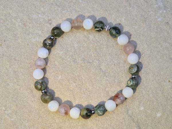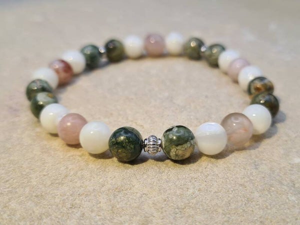 Ein hübsches, frisches Armband mit 8mm-Edelsteinperlen aus Perlmutt, Kirschblüten-Chalcedon und Regenwald-Rhyolith sowie Zwischenperlen aus Edelstahl und einer 925er Silber Verschlussperle.