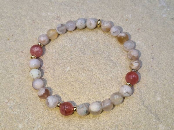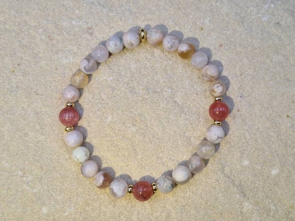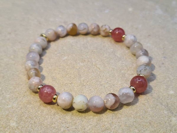 Ein hübsches, frisches Armband mit 8mm-Edelsteinperlen aus Kirschblüten-Achat und Rhodochrosit sowie Zwischenperlen aus 24-Karat vergoldetem Edelstahl.