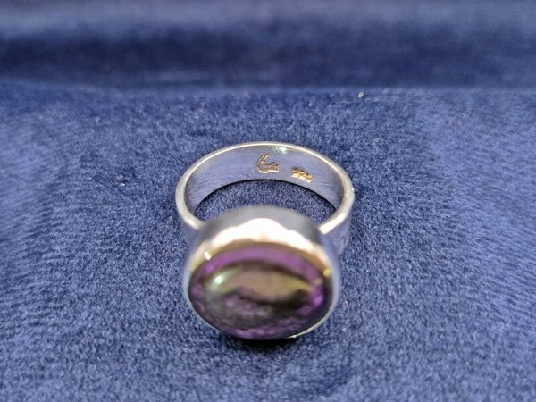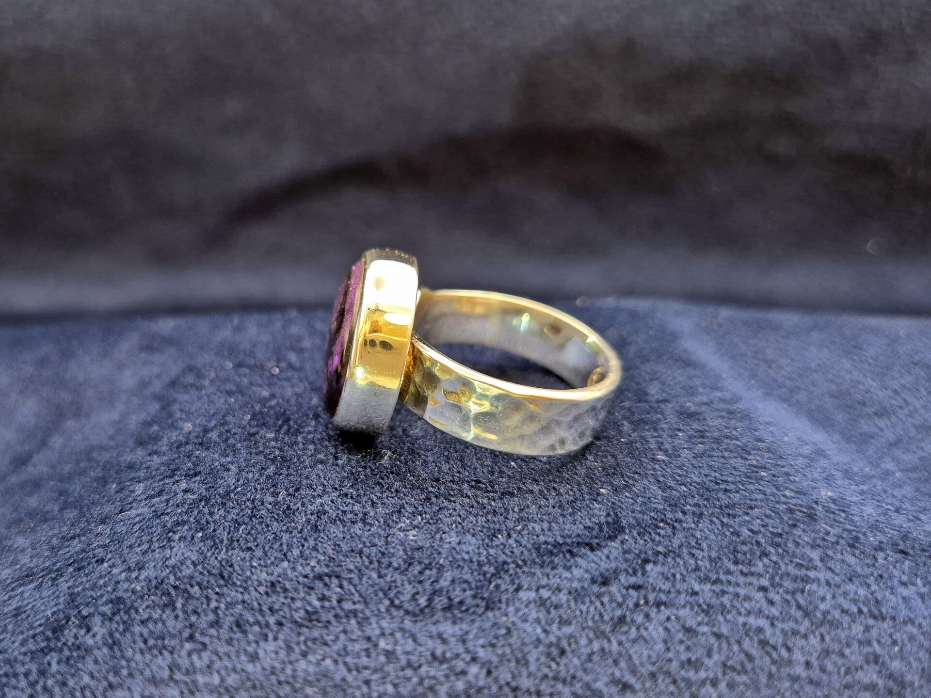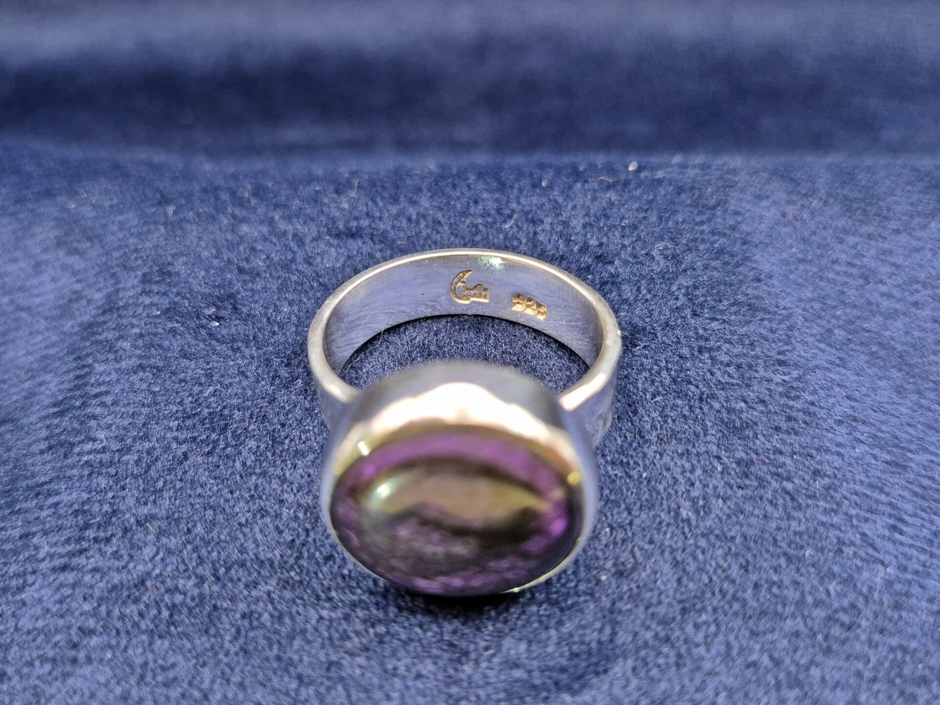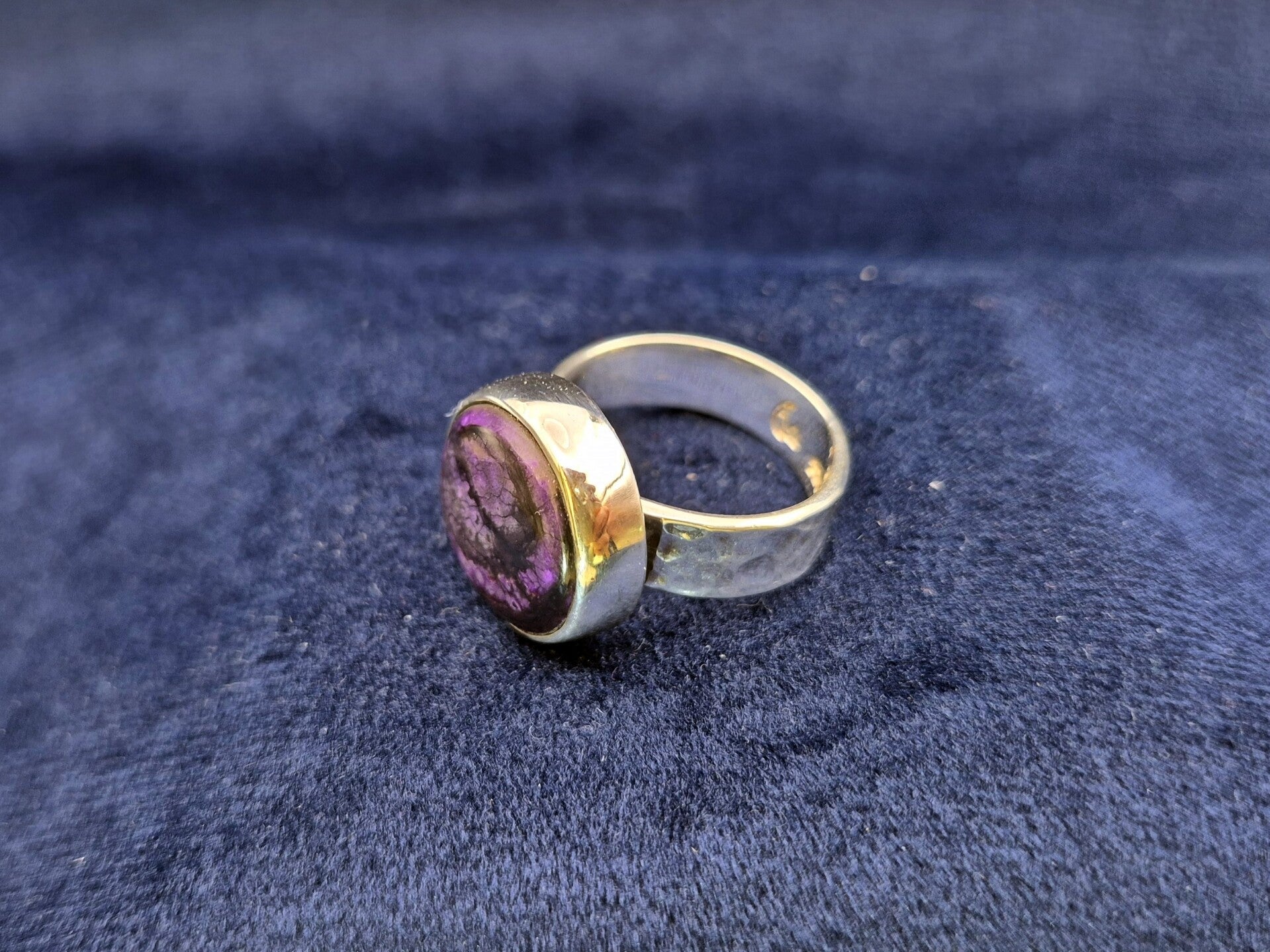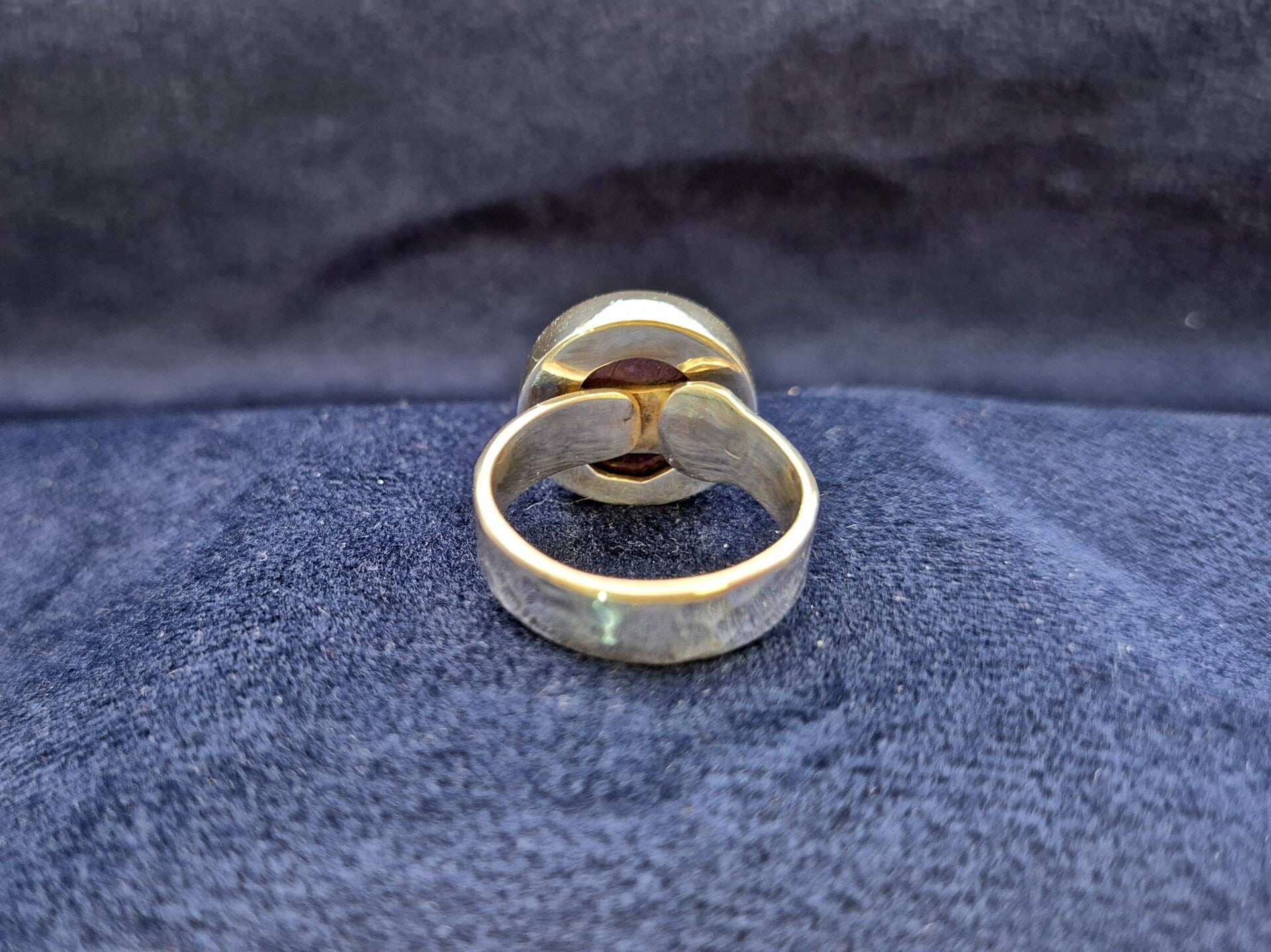 Ring aus 925er Silber, Ringschiene 6mm gehämmert, Durchmesser des Steins ca. 15mm.