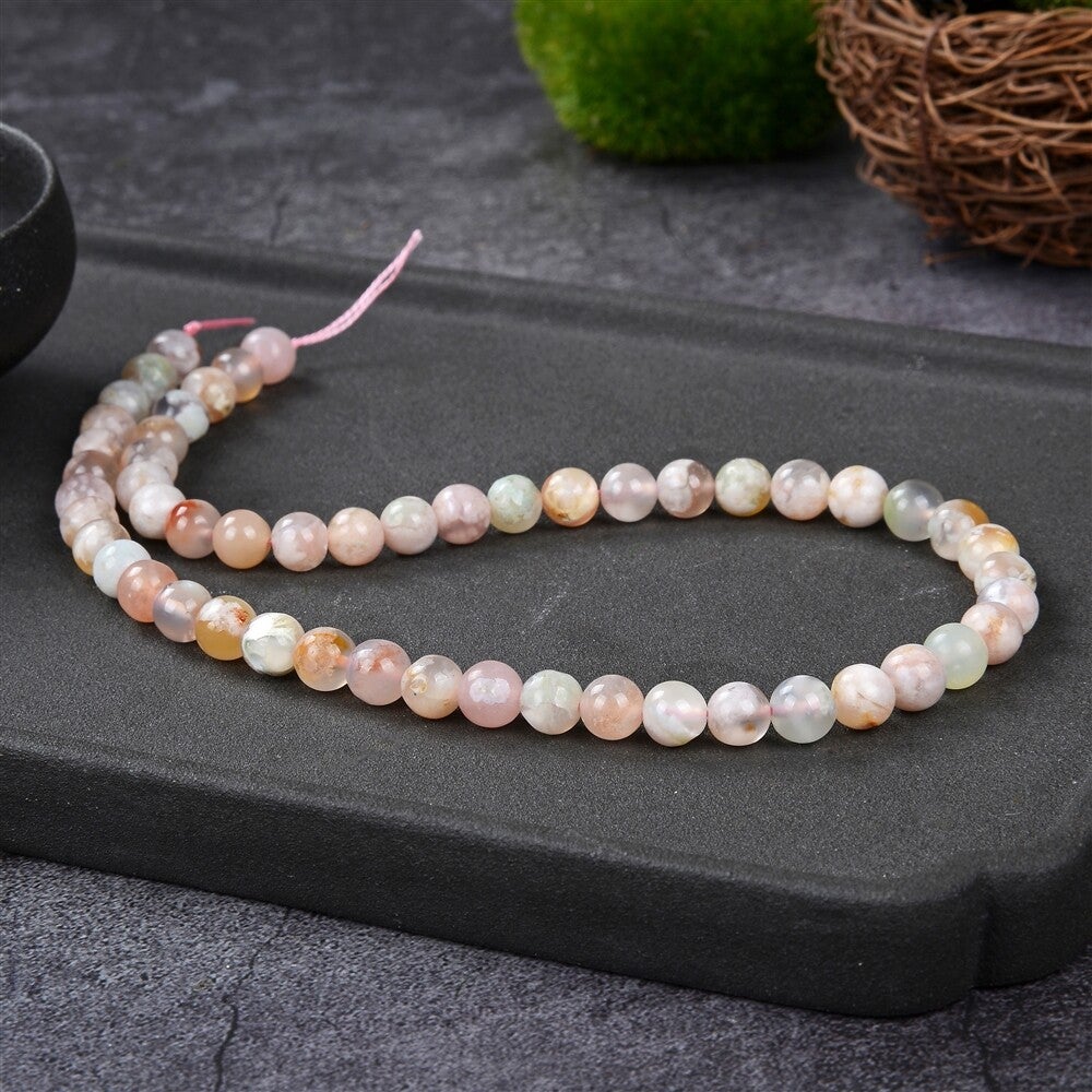 Zarte Farbtöne von Cremeweiß bis hellem Lachsrosa zeigen die Kugeln bei diesen schönen Kettensträngen. Seinen Namen erhielt das Mineral, da die Chalcedon-Einschlüsse im Achat wie die zarten Blätter von Kirschblüten aussehen.