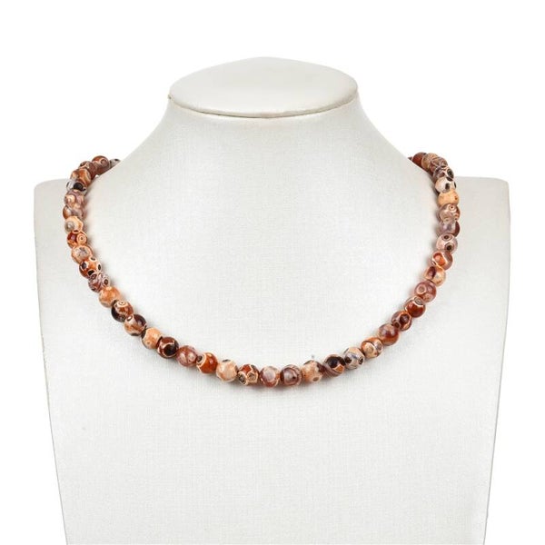 Die polierten 8mm-Kugeln zeigen das ganze Farbspektrum von zarten Cremefarben über kräftiges Rot-Orange bis hin zu dunklem Braun. Typischen für den Mongolei-Achat sind die runden Strukturen in der Maserung, dem das Mineral auch den Handelsnamen roter Augenachat verdankt. Ein weiteres Synonym ist Gobi-Achat.