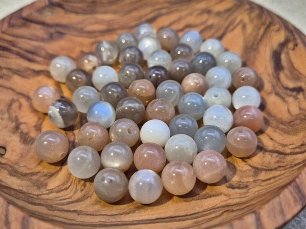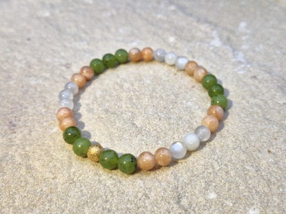 Ein hübsches, frisches Armband mit 6mm-Edelsteinperlen aus Baryt, Mondstein und Serpentin, sowie einer Verschlussperle aus vergoldetem 925er Silber.