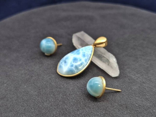 Wunderschöner Larimar-Anhänger mit Öse und passende Ohrstecker, in 750er Gold gefasst, Ohrstecker mit runden, transparenten Clipsen und Gold-Inlets