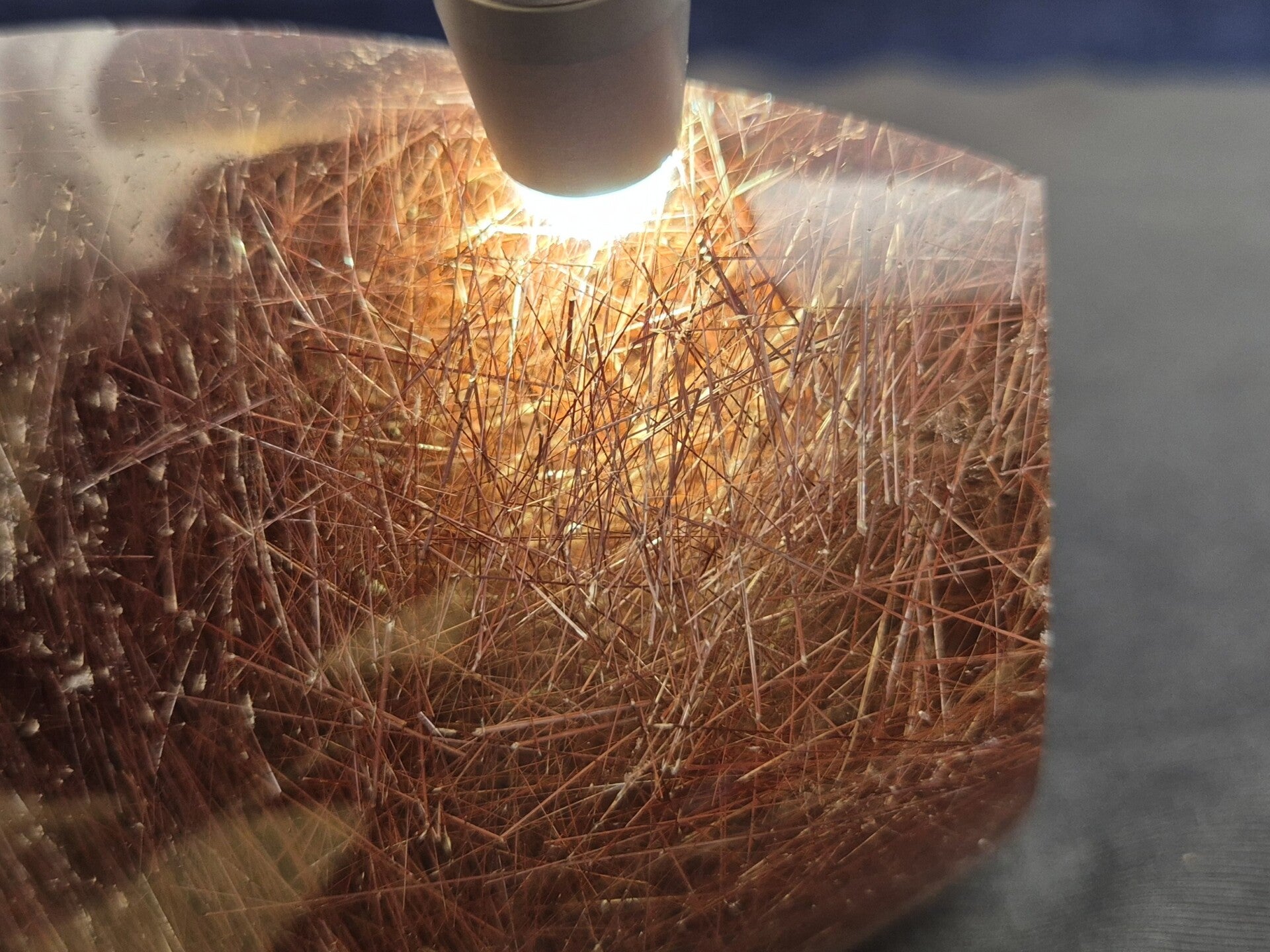 ZUSAMMENSETZUNG: Rutilfasern in Quarz (tetragonal/trigonal, primär)
