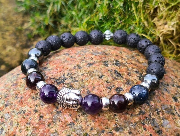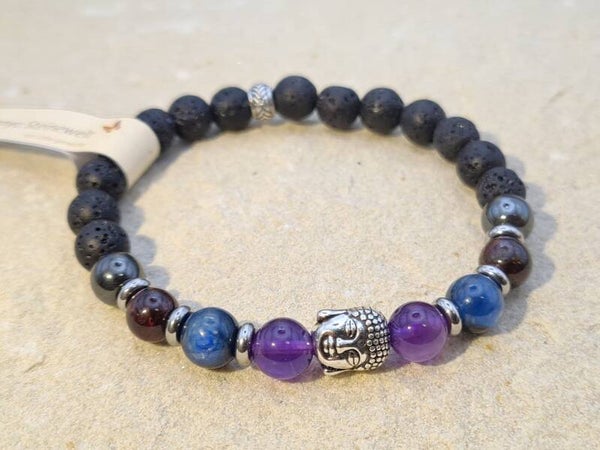 Dieses kraftvolle Schmuckstück wurde von Martin entworfen und ist nicht nur wegen seines Aussehens, sondern auch wegen seiner Bedeutung einzigartig. Die kraftvolle Kombination dieser potenten Edelsteinen eröffnet einen vertikalen Energiekanal, aus der Tiefe der Erde (Hämatit und Granat) bis in die feinschwingenden Höhen (Disthen und Amethyst). Der Buddha-Kopf, welcher das höchste Bewusstsein (Sanskit: Chaitanya) repräsentiert, lässt zur Ruhe kommen und erinnert daran, die äußere Welt mit etwas mehr Gelassenheit und Selbstreflexion wahrzunehmen. Alles ist miteinander verbunden. Dieses Armband hilft dabei, genau das erkennen zu können. Der verwendete Lavastein bringt energetische Ruhe ins Armband, denn Lava erdet und harmoniesiert all zu erhitzte Energien.