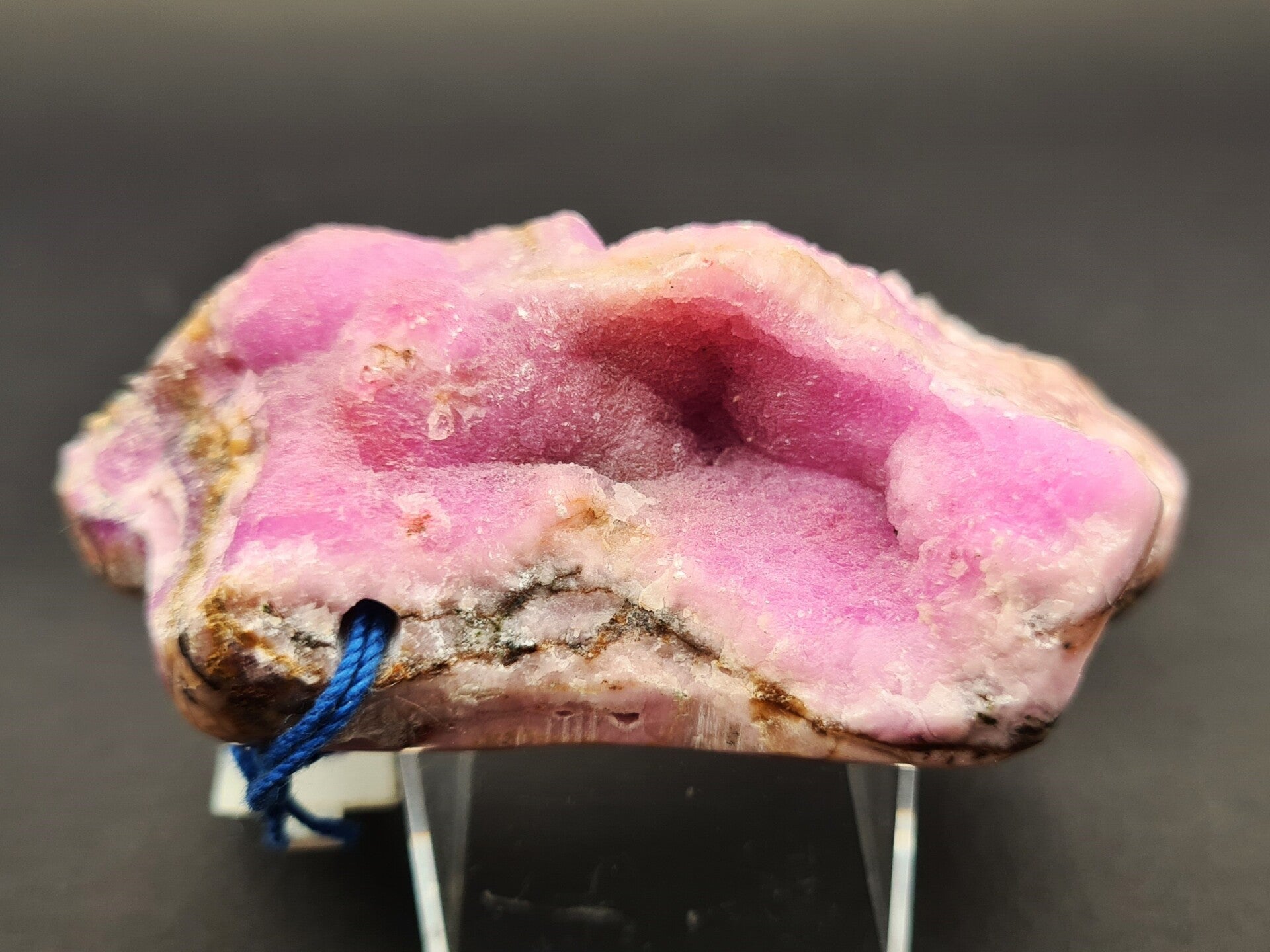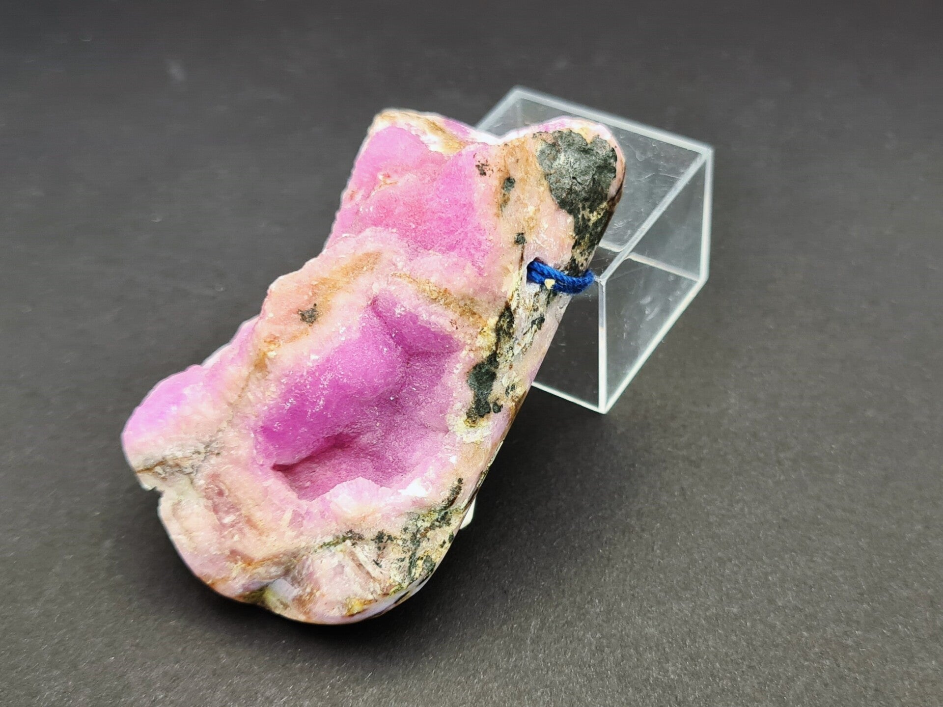 Dieser Anhänger zeigt auf der Ansichtsseite wunderschön seine winzigen Kristalle, rückseitig wurde er geebnet angeschliffen. Anders zu oberflächlichen Kobaltcalciten, die oft im Internet angeboten werden, besteht dieser, bis auf ein Einschlüsse von Matrixgestein, komplett aus Kobaltcalcit.